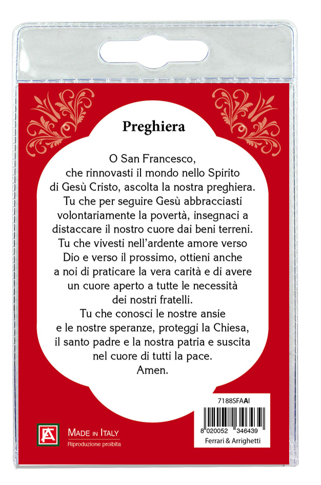 Il blister si presenta con all'interno un cartoncino con l'immagine di San Francesco con braccia aperte e sul retro è stampata una preghiera a lui dedicata.