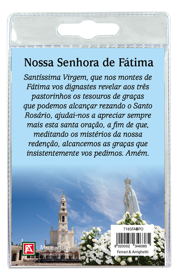 Il blister si presenta con all'interno un cartoncino con l'immagine della Madonna di Fatima.
