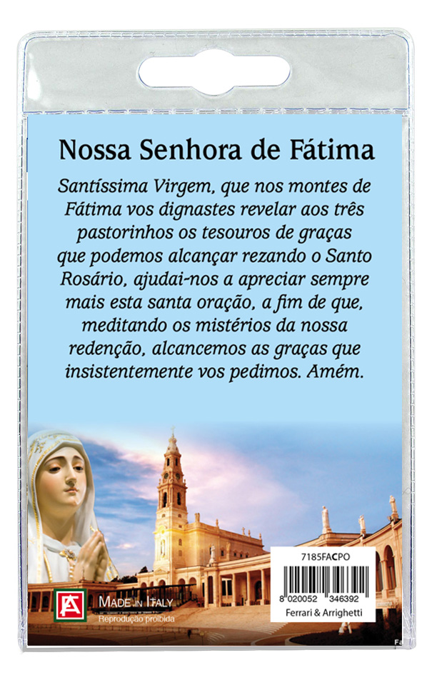 Il blister si presenta con all'interno un cartoncino raffigurante l'apparizione della Madonna di Fatima.