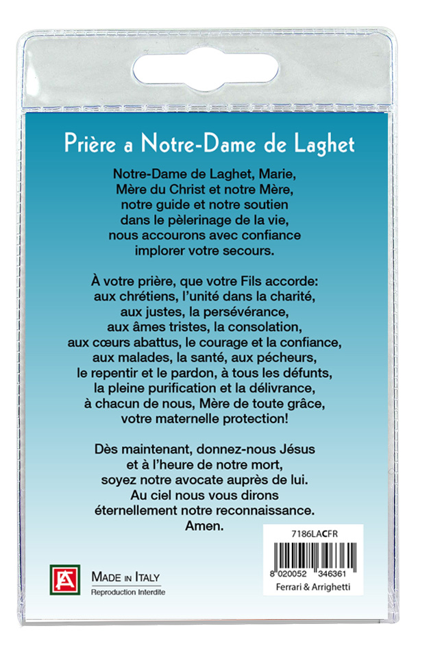 Il blister si presenta con all'interno un cartoncino con l'immagine della Madonna di Laghet e del Santuario a lei dedicato.