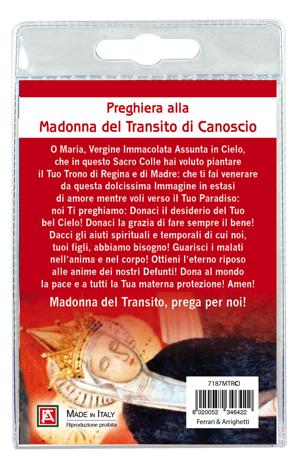 Il blister si presenta con all'interno un cartoncino che rappresenta l'interno del Santuario dedicato alla Madonna del Transito.