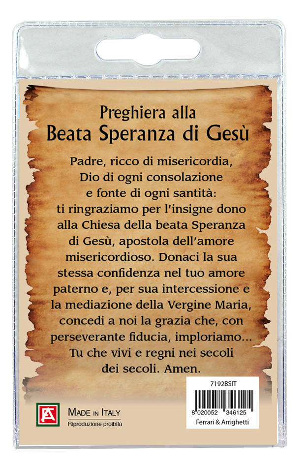 Il blister si presenta con all'interno un cartoncino, con la foto della Beata Speranza di Gesù e sul retro è stampata una preghiera a lei dedicata.