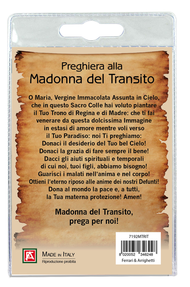Il blister si presenta con all'interno un cartoncino con la foto della Madonna del Transito e sul retro è stampata una preghiera a lei dedicata.