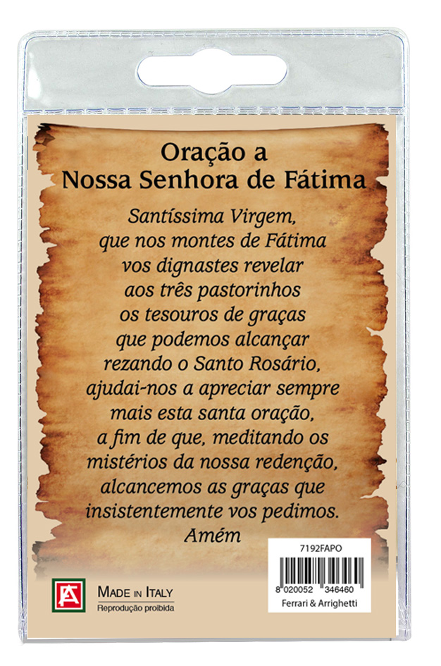 Il blister si presenta con all'interno un cartoncino, con l'immagine dell'apparizione della Madonna di Fatima e sul retro è stampata una preghiera in portoghese a lei dedicata.