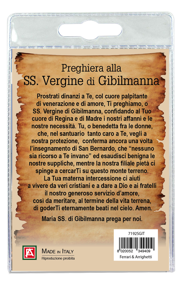 Il blister si presenta con all'interno un cartoncino, con l'immagine dell'apparizione della Madonna di Gibilmanna e sul retro è stampata una preghiera in italiano a lei dedicata.