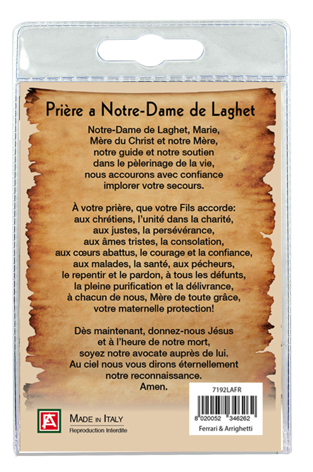Il blister si presenta con all'interno un cartoncino, con la foto della Madonna di Laghet e sul retro è stampata una preghiera a lei dedicata.