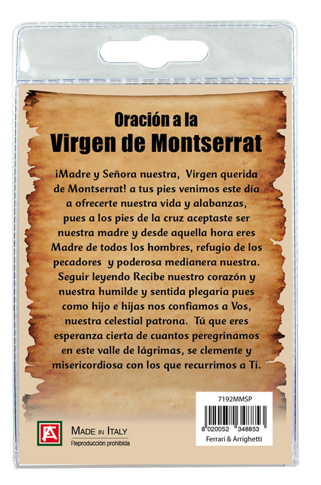 Il blister si presenta con all'interno un cartoncino, con la foto della Madonna di Montserrat e sul retro è stampata una preghiera in spagnolo a lei dedicata.