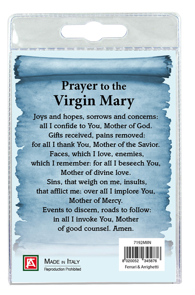 Il blister si presenta con all'interno un cartoncino con la foto della Madonna Miracolosa e sul retro è stampata una preghiera a lei dedicata.