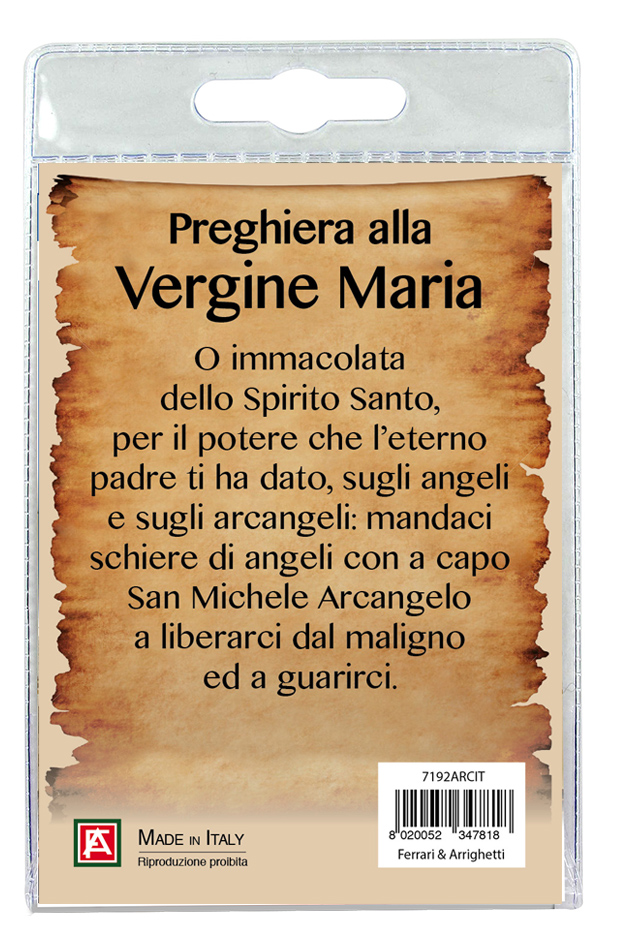 Il blister si presenta con all'interno un cartoncino, con la foto del S. Michele Arcangelo (a Monte S. Angelo-Puglia) e sul retro è stampata una preghiera a lei dedicata.