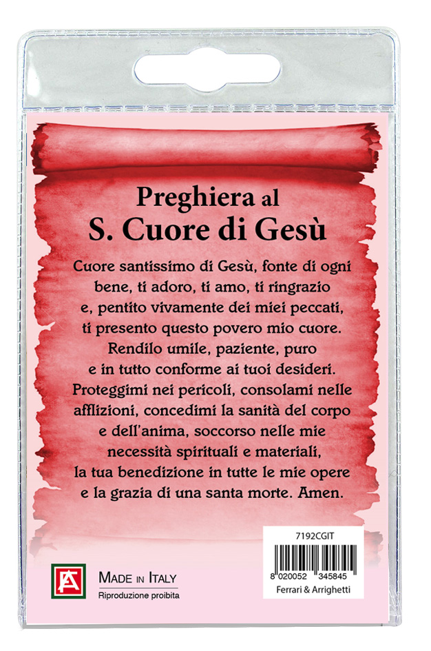 Il blister si presenta con all'interno un cartoncino, con la foto del Sacro Cuore di Gesù e sul retro è stampata una preghiera a lui dedicata.