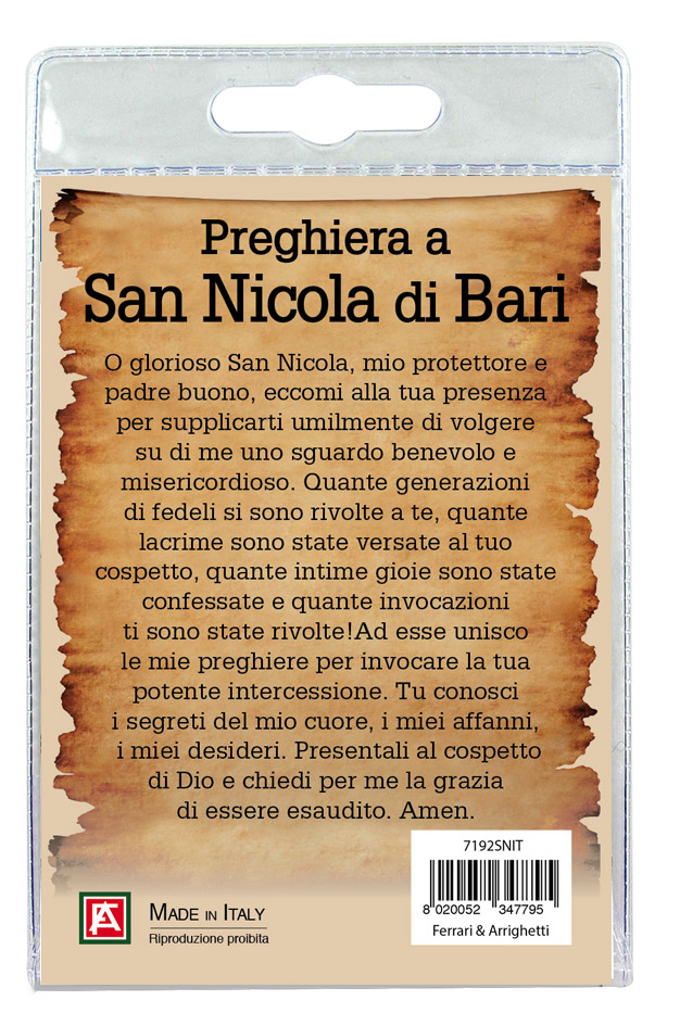 Il blister si presenta con all'interno un cartoncino, con la foto di San Nicola di Bari e sul retro è stampata una preghiera a lui dedicata.