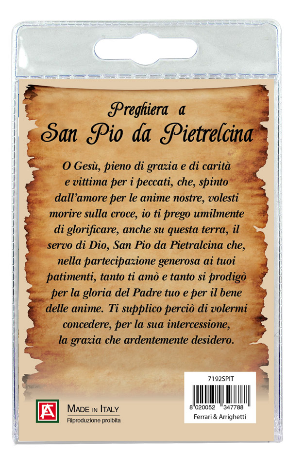 Il blister si presenta con all'interno un cartoncino, con la foto di San Pio da Pietrelcina e sul retro è stampata una preghiera a lui dedicata.