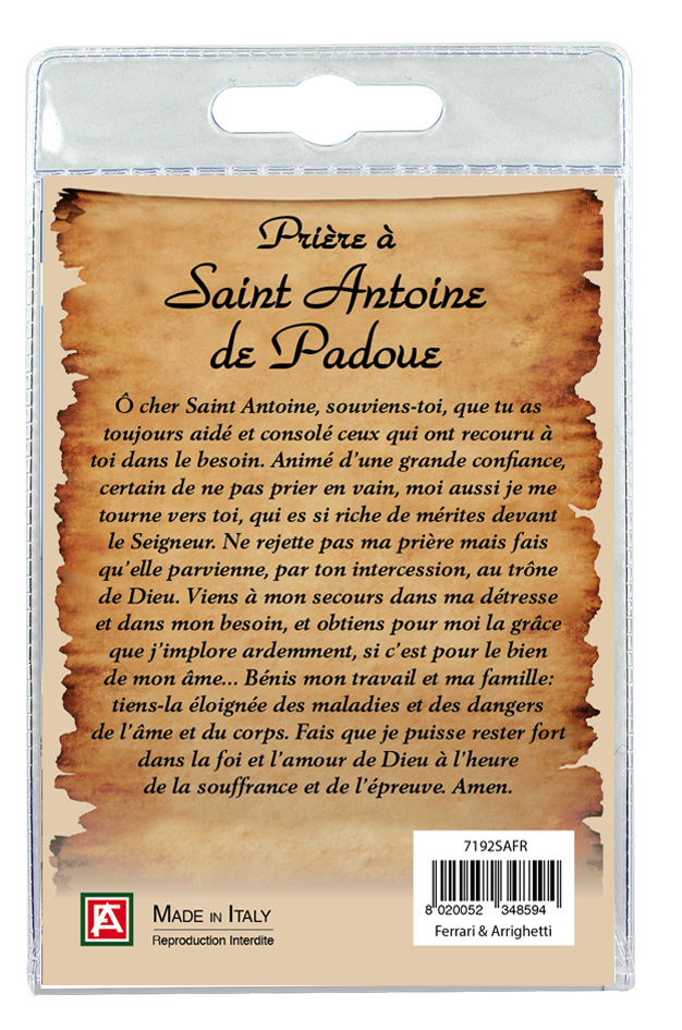 Il blister si presenta con all'interno un cartoncino, con la foto di Sant Antonio di Padova e sul retro è stampata una preghiera a lui dedicata.