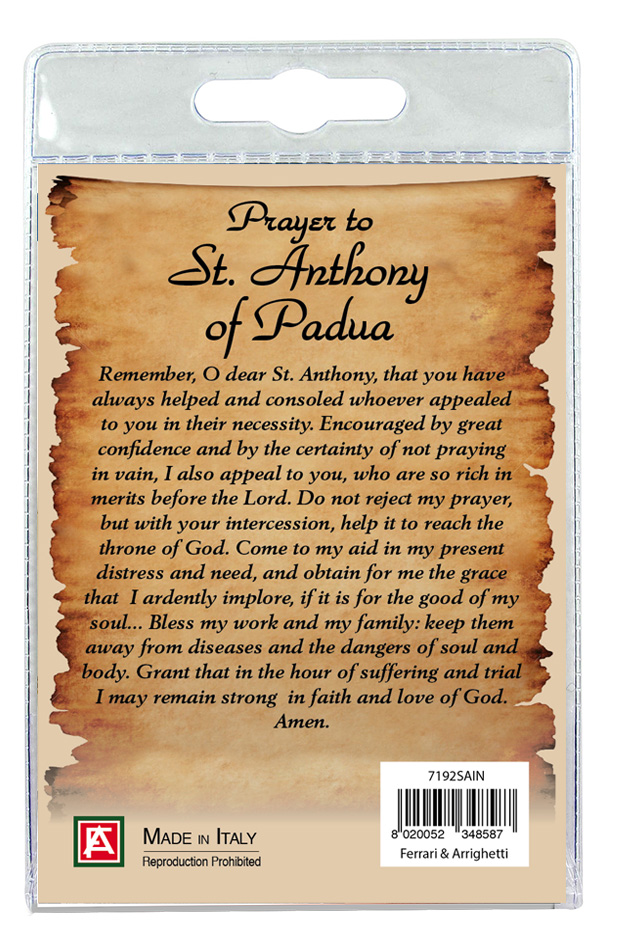 Il blister si presenta con all'interno un cartoncino, con la foto di Sant Antonio di Padova e sul retro è stampata una preghiera a lui dedicata.