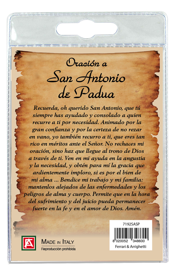 Il blister si presenta con all'interno un cartoncino, con la foto di Sant Antonio di Padova e sul retro è stampata una preghiera a lui dedicata.