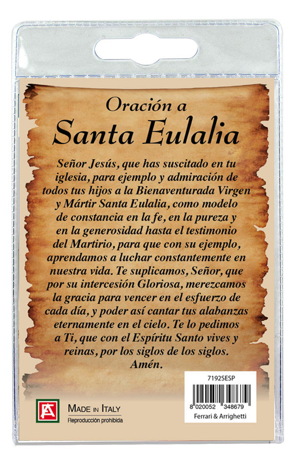 Il blister si presenta con all'interno un cartoncino, con la foto di Sant Eulalia e sul retro è stampata una preghiera a lei dedicata. Applicata con gancietto vi è un piccolo ciondolo con la resina lucida di Sant Eulalia e la perla che ci ricorda la frase scritta sul cartoncino. *I colori della perla possono variare.