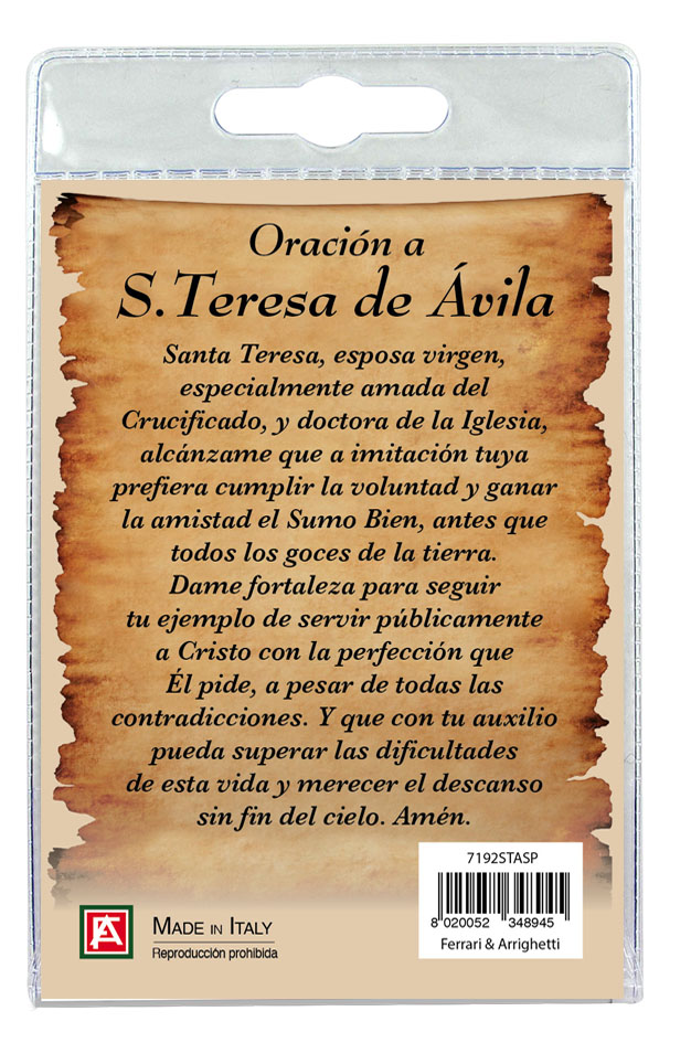Il blister si presenta con all'interno un cartoncino con la foto di Santa Teresa d'Avila e sul retro è stampata una preghiera a lei dedicata.