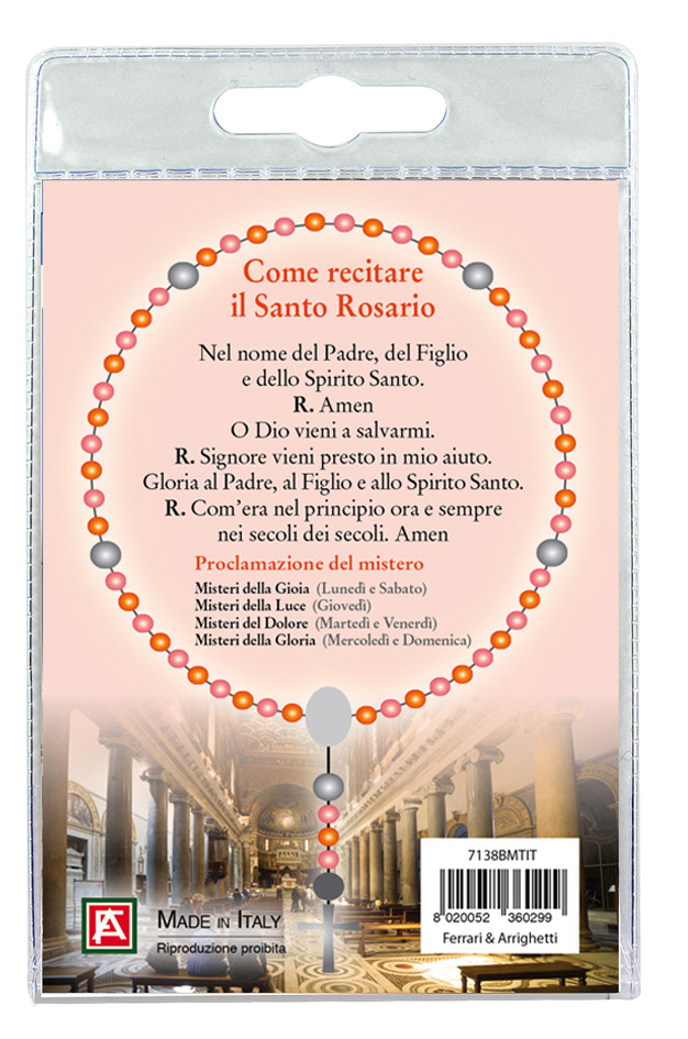 Il blister si presenta con all'interno un cartoncino, rappresentante la foto della Basilica di Santa Maria in Trastevere ed una decina con grani tondi in legno di mm 4 che, con gancetto si può applicare come ciondolo.