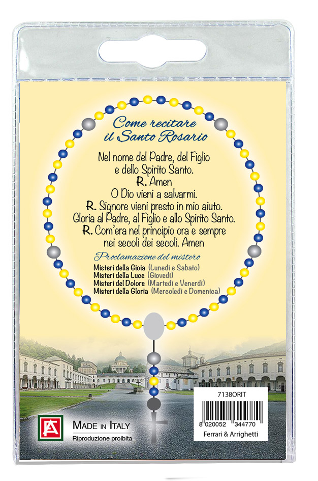 Il blister si presenta con all'interno un cartoncino, rappresentante la foto del Santuario di Oropa ed una decina con grani tondi in legno di mm 4 che, con gancetto si può applicare come ciondolo.
