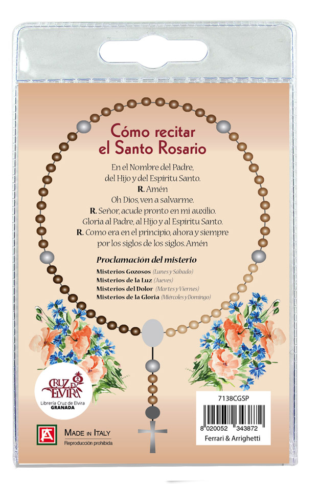Sul retro del cartoncino è spiegato come si recita il rosario in spagnolo