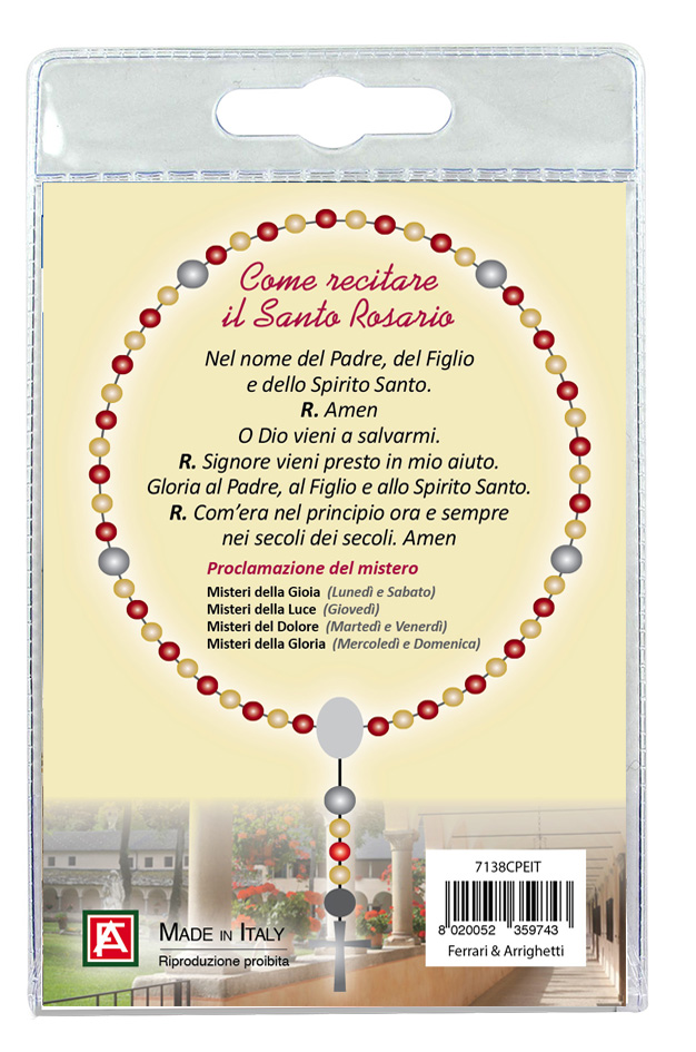 Sul retro del cartoncino è spiegato come si recita il rosario.