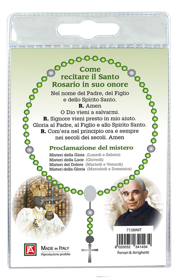 Il blister si presenta con all'interno un cartoncino, rappresentante la foto della Madonna dell'Incoronata ed una decina con grani tondi in legno di mm 4 che, con gancetto si può applicare come ciondolo.