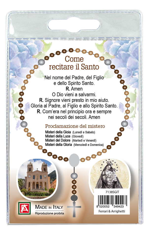 Il blister si presenta con all'interno un cartoncino, rappresentante la foto della Madonna di Gibilmanna ed una decina con grani tondi in legno di mm 4 che, con gancetto si può applicare come ciondolo.