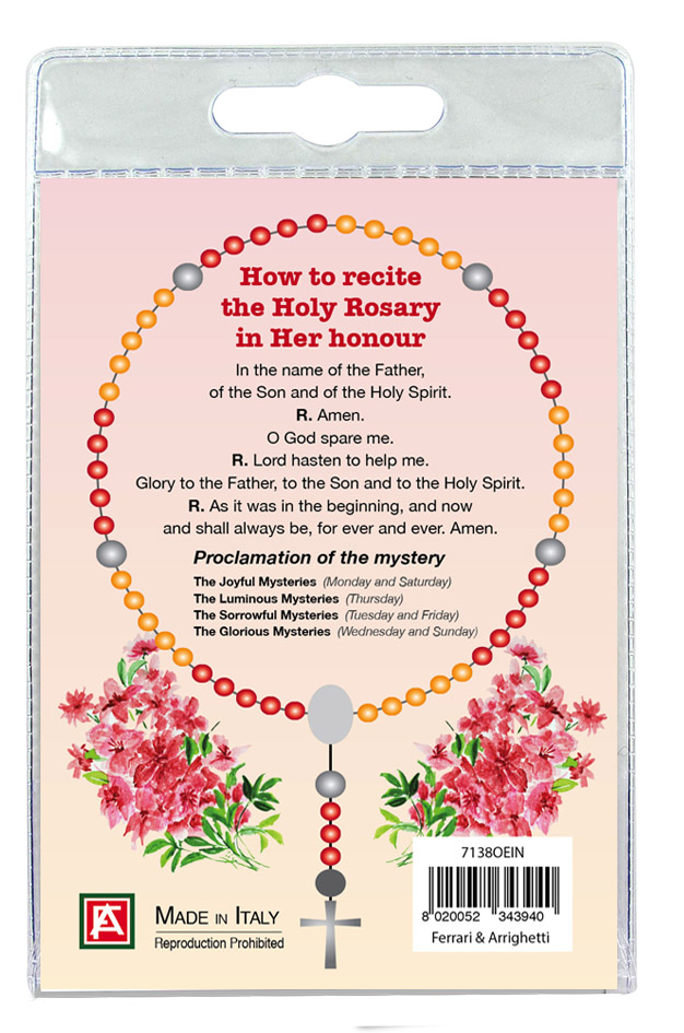 Sul retro del cartoncino è spiegato come si recita il rosario in inglese.