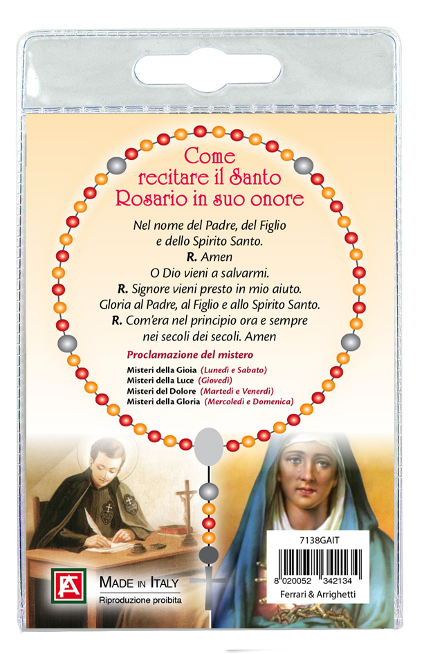 Il blister si presenta con all'interno un cartoncino, rappresentante la foto di S. Gabriele dell'Addolorata ed una decina con grani tondi in legno di mm 4 che, con gancetto si può applicare come ciondolo.