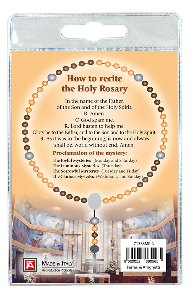 Sul retro del cartoncino è spiegato come si recita il rosario.