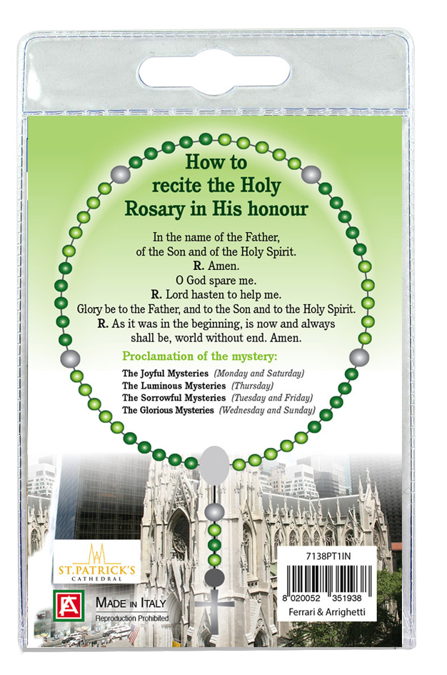 Il blister si presenta con all'interno un cartoncino, rappresentante la foto del Saint Patrick ed una decina con grani tondi in legno di mm 4 che, con gancetto si può applicare come ciondolo.