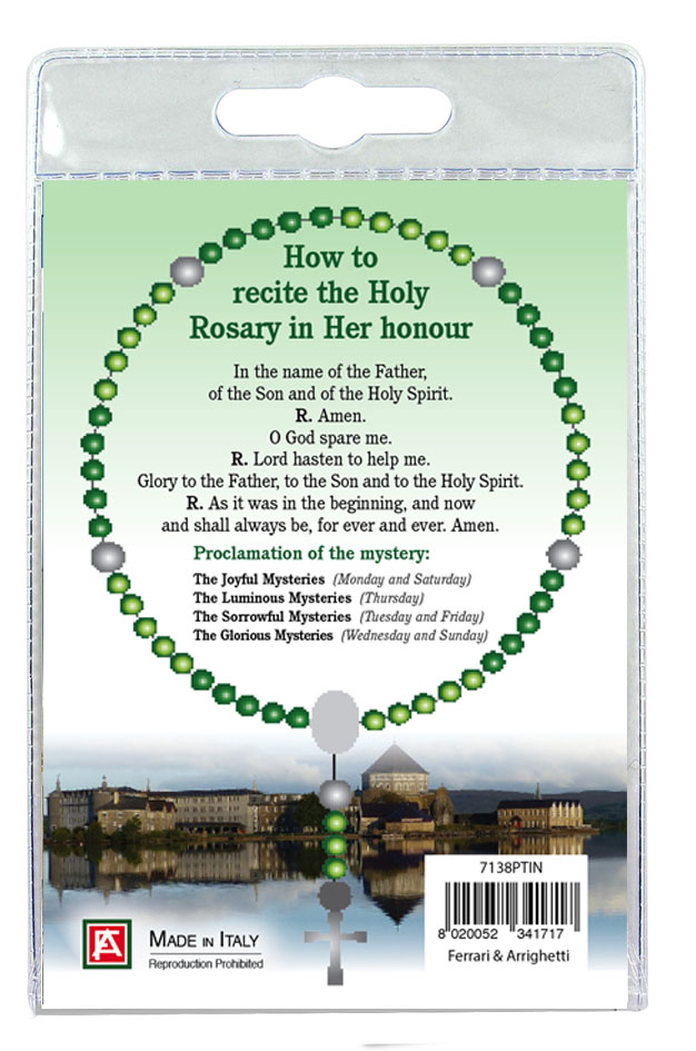 Il blister si presenta con all'interno un cartoncino, rappresentante la foto di Saint Patrick (Lough Derg) ed una decina con grani tondi in legno di mm 4 che, con gancetto si può applicare come ciondolo.