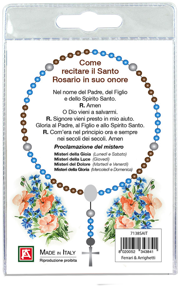 Il blister si presenta con all'interno un cartoncino, rappresentante la foto di Sant'Antonio ed una decina con grani tondi in legno di mm 4 che, con gancetto si può applicare come ciondolo.