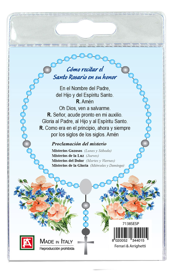Sul retro del cartoncino è spiegato come si recita il rosario in spagnolo