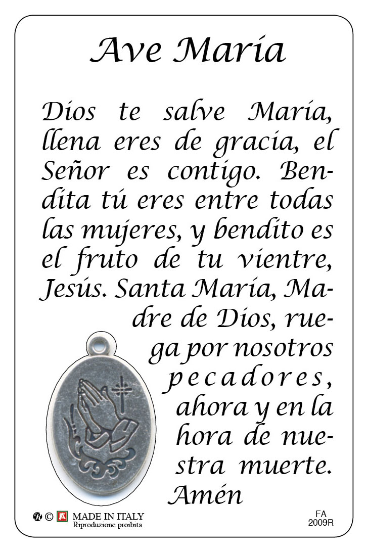 Card della Cattedrale di Barcelona con sul retro la preghiera dell'Ave Maria in lingua spagnola. Nella card è inserita una medaglia resinata raffigurante Sant'Eulalia. La misura di questa card è di cm 5,5 x 8,5.