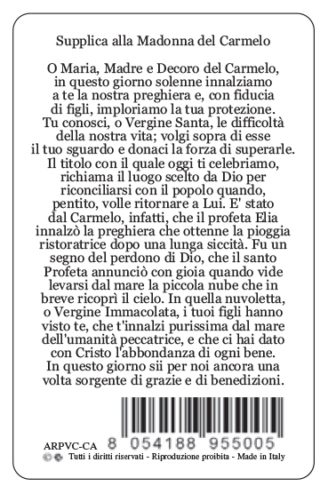 Questa immagine plastificata rappresenta la Madonna del Carmelo ed è impreziosita da una medaglia in resina a colori che ha attorno una cornice in argento a caldo. La Vergine Maria del Monte Carmelo (o anche del Carmine) costituisce una delle devozioni mariane più antiche e più amate dalla cristianità, risalente addirittura ai tempi dei profeti; ad essa sono ovunque dedicate feste, chiese e santuari, in Italia e nel mondo.