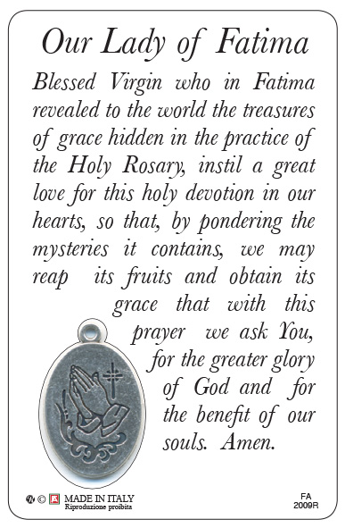 Card della Madonna di Fatima con sul retro una preghiera in inglese a lei dedicata. Nella card è inserita una medaglia resinata raffigurante la Madonna di Fatima. La misura di questa card è di cm 5,5 x 8,5.