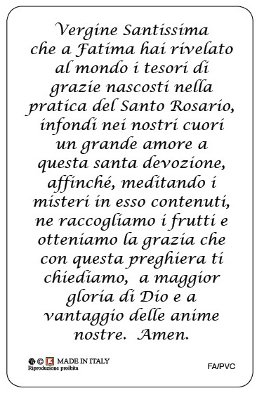 Questa immagine plastificata in PVC rappresenta la Madonna di Fatima. Sul retro c'è una preghiera in italiano a lei dedicata. La misura di questa card è di cm 5,5 x 8,5.