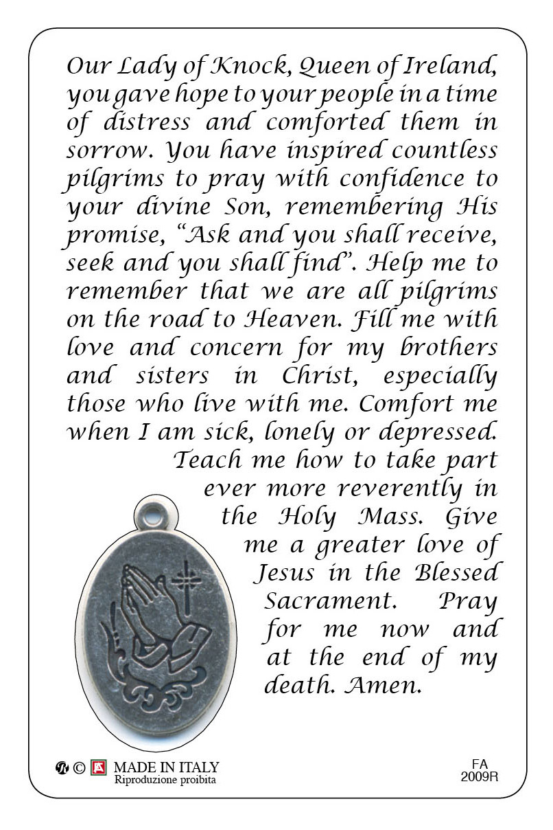 Card della Madonna di Knock con sul retro una preghiera in inglese a lei dedicata. Nella card è inserita una medaglia resinata raffigurante la Madonna di Knock. La misura di questa card è di cm 5,5 x 8,5.