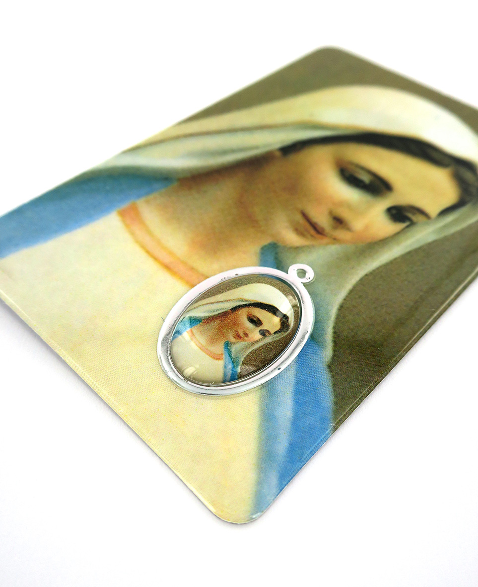 Questa immagine plastificata rappresenta la Madonna di Medugorje ed è impreziosita da una medaglia in resina a colori che ha attorno una cornice in argento a caldo. Con il termine "apparizioni di Medjugorje si intende una serie di presunti fenomeni sovrannaturali iniziati il 24 giugno 1981 a Medjugorje, cittadina dell'attuale Bosnia-Erzegovina, e tuttora in corso.