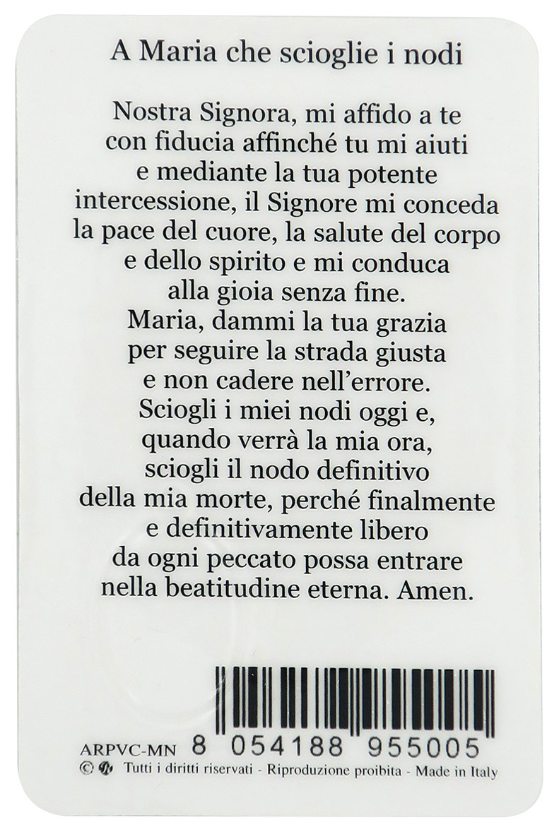 Questa immagine plastificata rappresenta Maria che scioglie i nodi ed è impreziosita da una medaglia in resina a colori che ha attorno una cornice in argento a caldo. Maria che scioglie i nodi (Virgen Maria Knotenloserin) è un dipinto a olio su tela realizzato intorno al 1700 dal pittore tedesco Johann Georg Melchior Schmidtner e conservato ad Augusta; da esso ha avuto origine una grande devozione mariana.