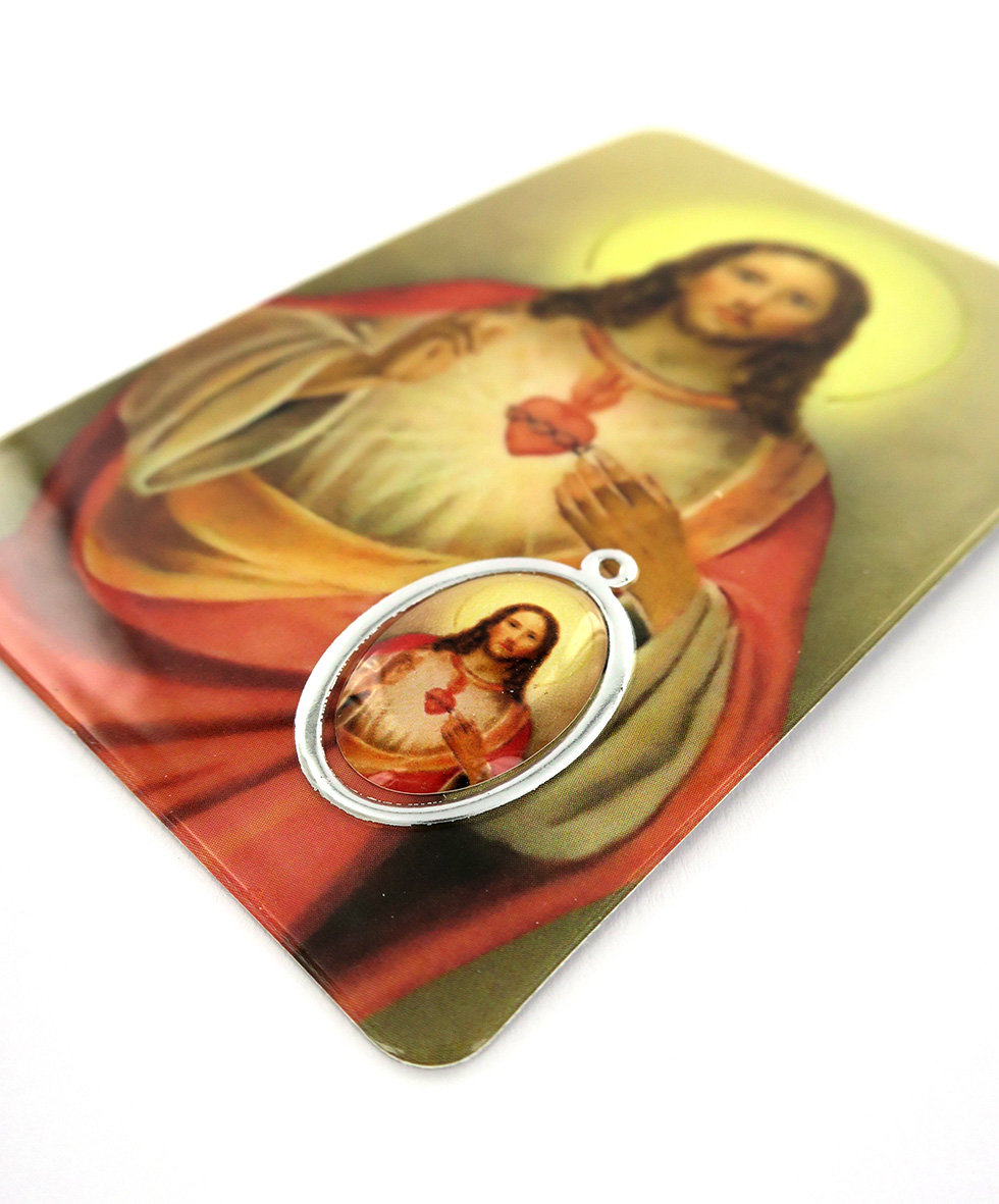 Questa immagine plastificata rappresenta il Sacro Cuore di Gesù ed è impreziosita da una medaglia in resina a colori che ha attorno una cornice in argento a caldo.