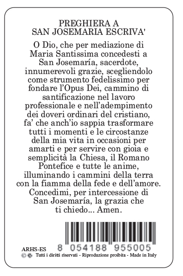 Questa immagine plastificata rappresenta San Josemaria Escrivà ed è impreziosita da una medaglia in resina a colori che ha attorno una cornice in argento a caldo. San Josemaria Escrivà de Balaguer (Huesca, 1902 - Roma, 1975) è stato un presbitero spagnolo, fondatore dell'Opus Dei. È stato canonizzato nel 2002 da Papa Giovanni Paolo II.