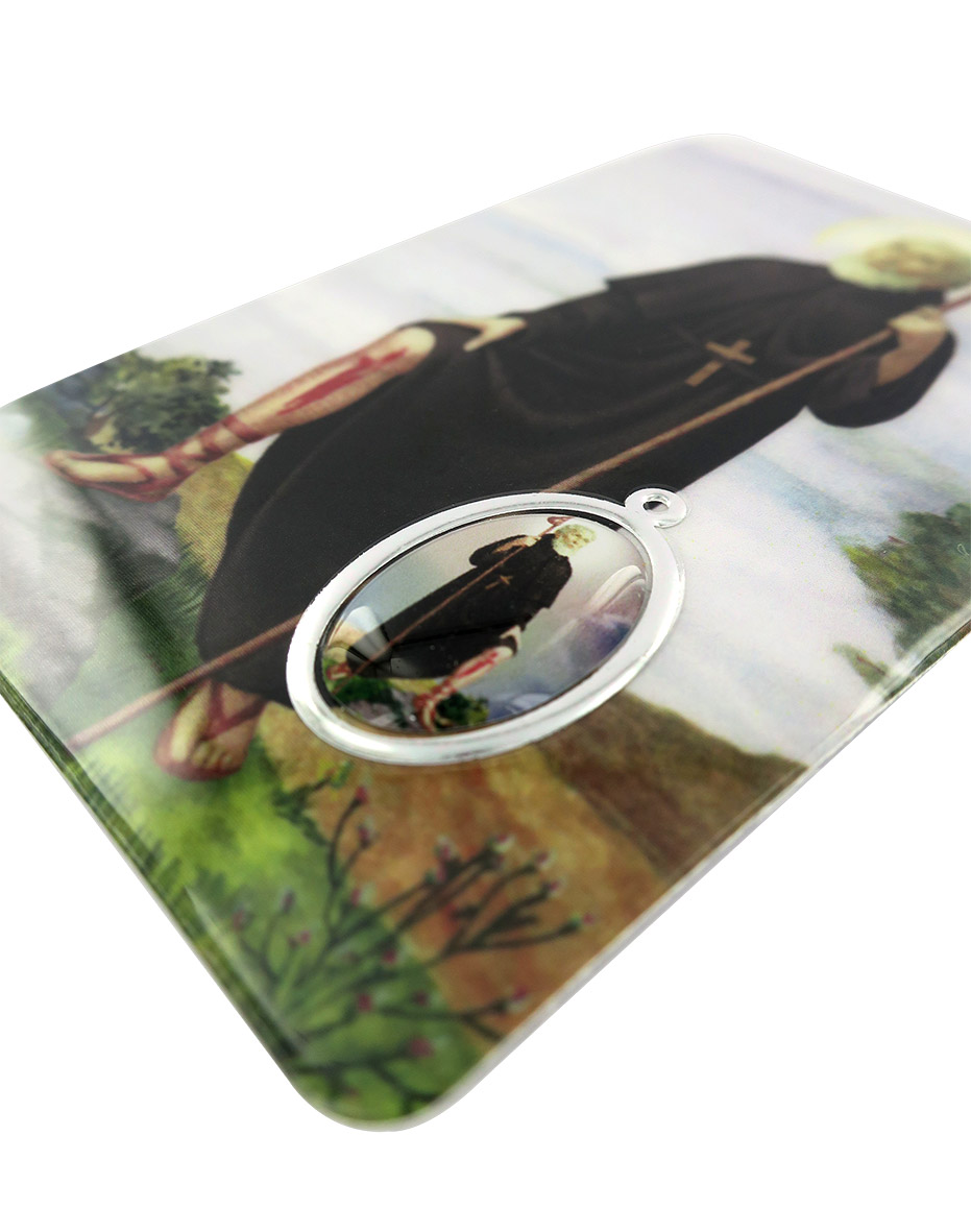 Questa immagine plastificata rappresenta San Pellegrino ed è impreziosita da una medaglia in resina a colori che ha attorno una cornice in argento a caldo.