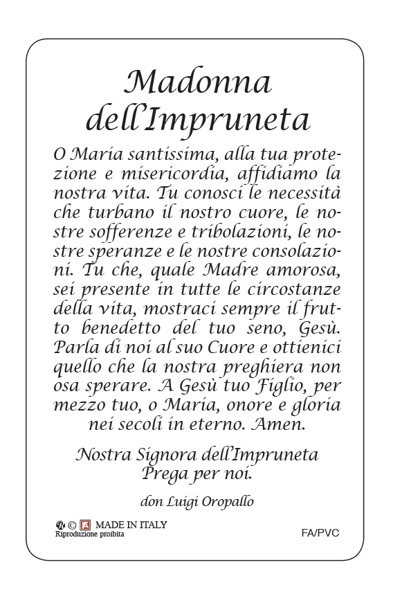 Questa immagine plastificata in PVC rappresenta la Madonna di Impruneta. Sul retro c'è una preghiera in italiano a lei dedicata. La misura di questa card è di cm 5,5 x 8,5.