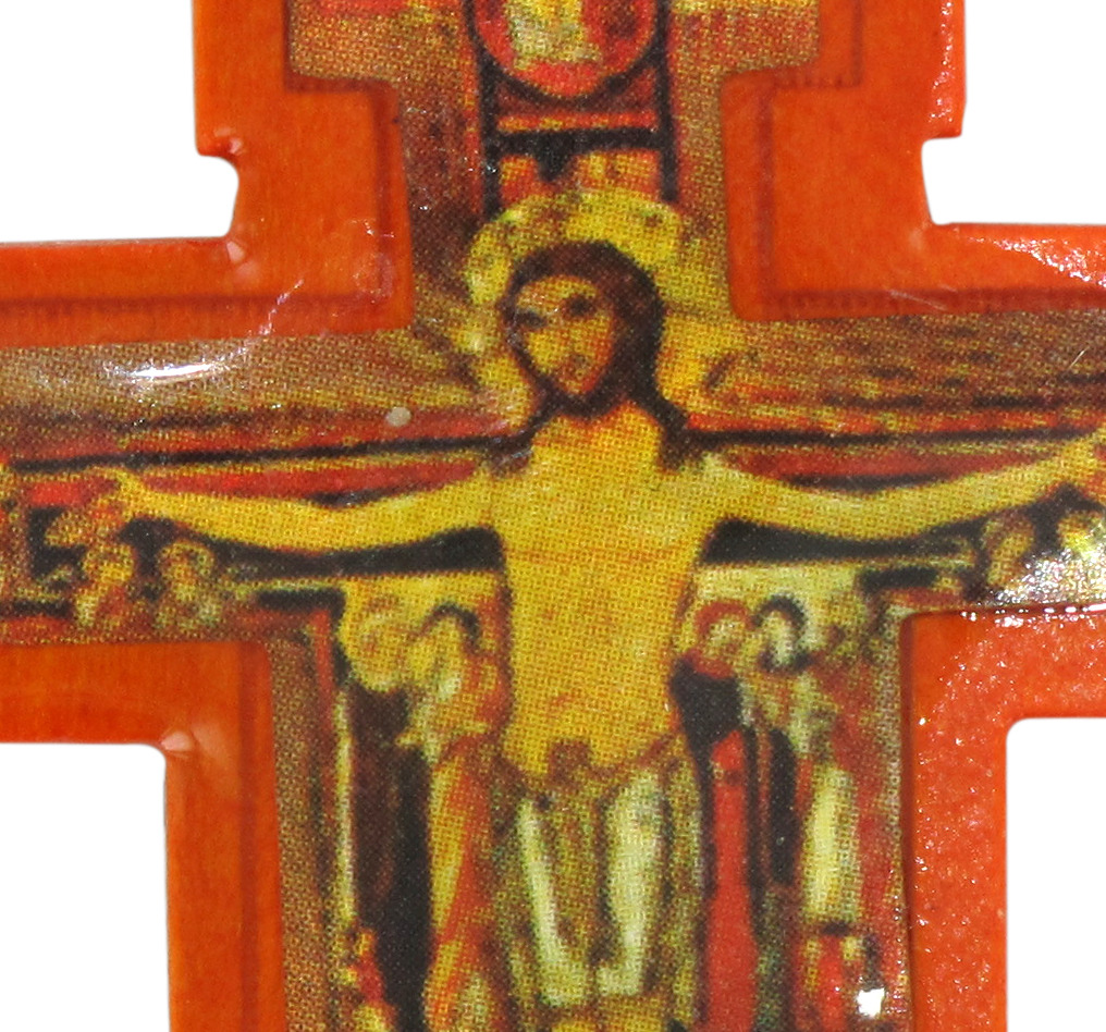 Croce di San Damiano con immagine resinata. Misure della croce: 4,5 x 3 cm. Fornito con cordoncino in stoffa marrone.