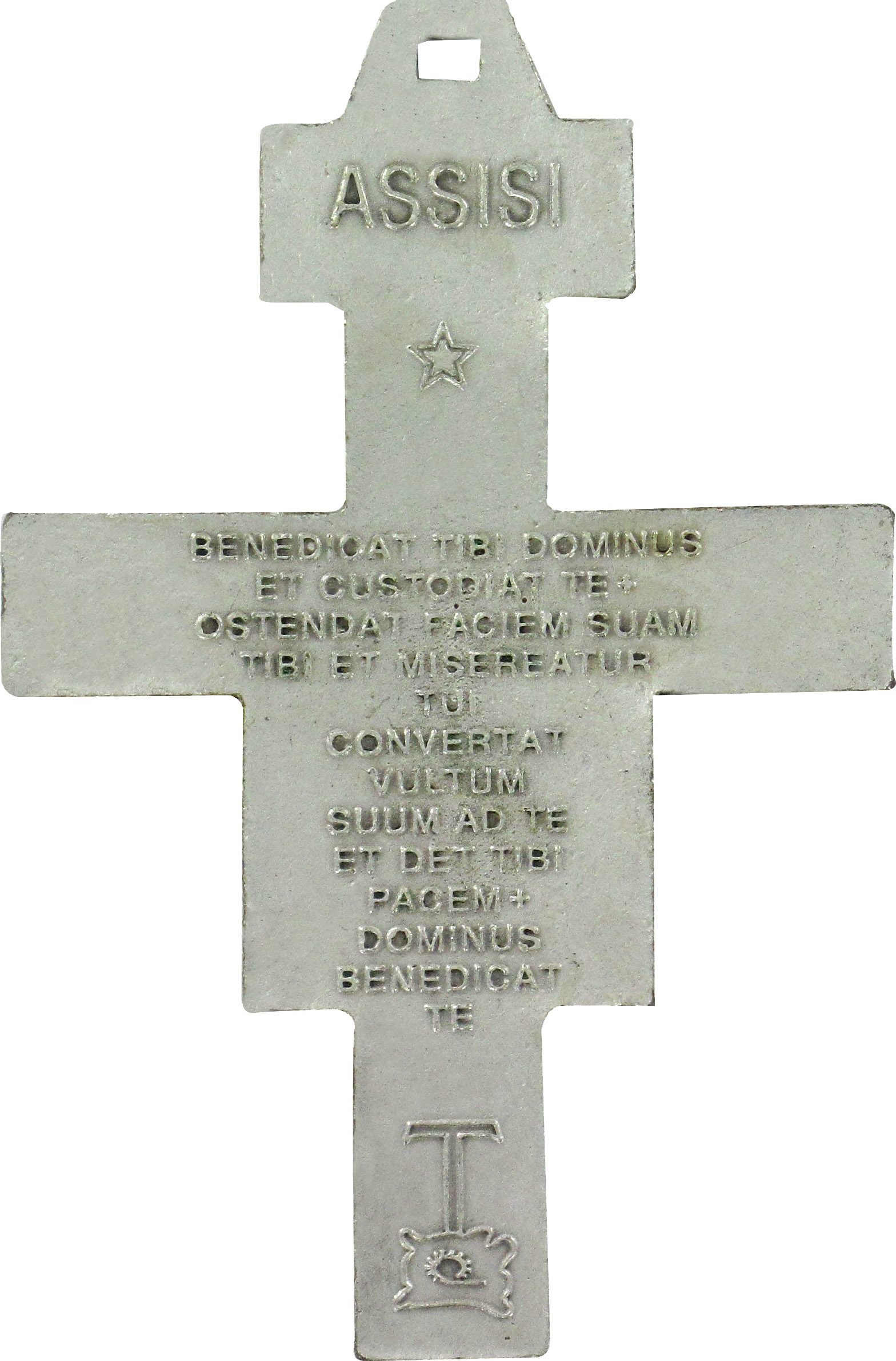Croce pendente di San Damiano in metallo argentato di altezza 8,5 cm. Sul retro c'è la scritta Assisi con frase. Realizzato in Italia.