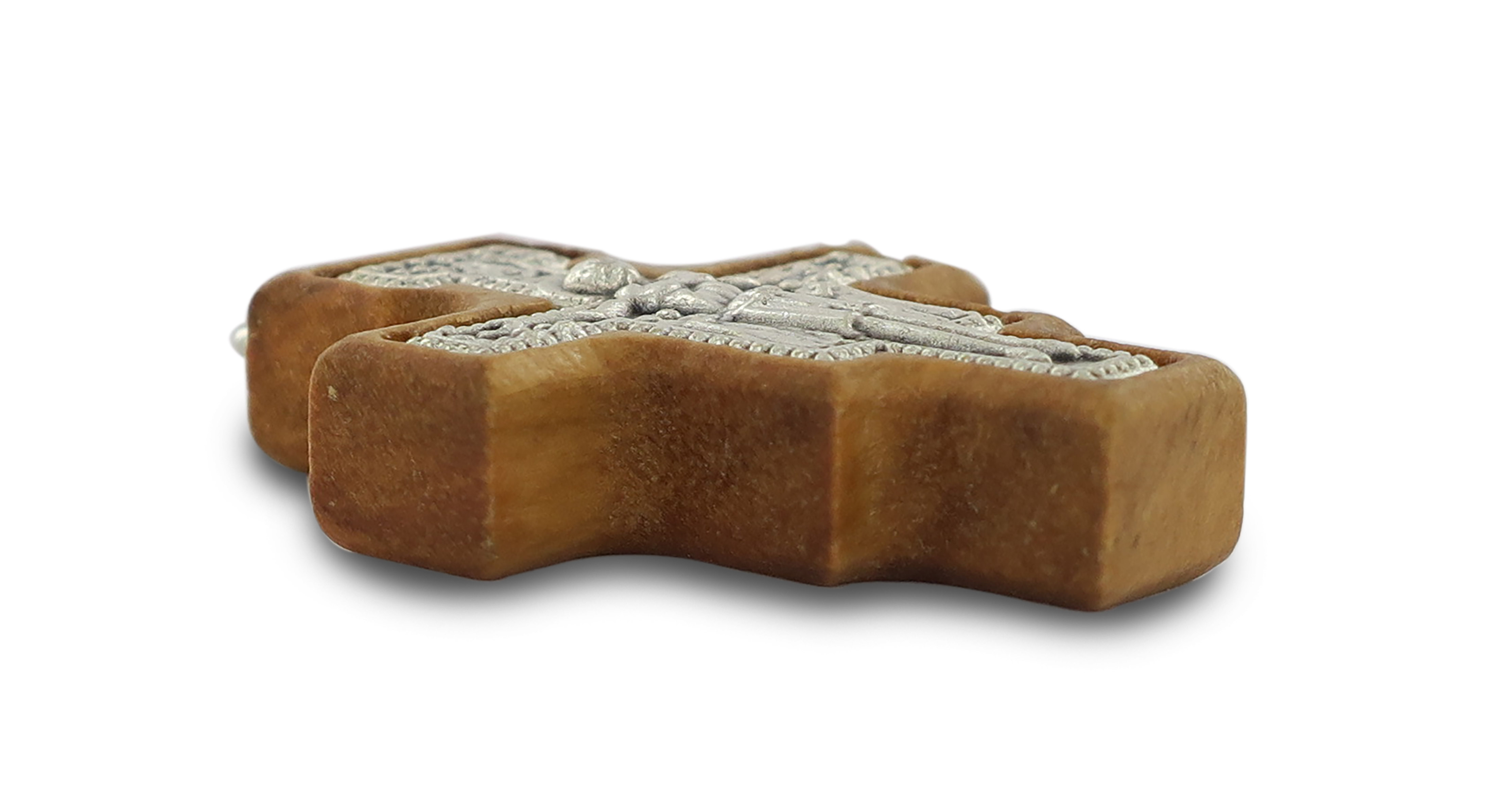Croce pendente di San Damiano in metallo ossidato su legno d'ulivo, completa di cordone.