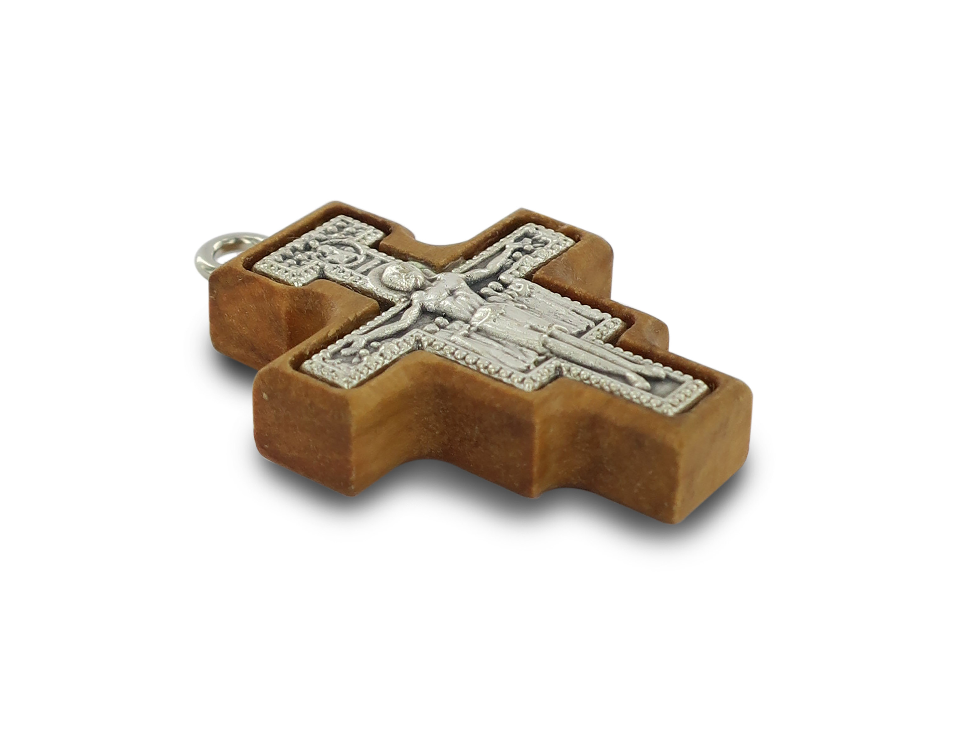 Croce San Damiano in metallo ossidato su legno ulivo con cordone - 3 x 2 cm