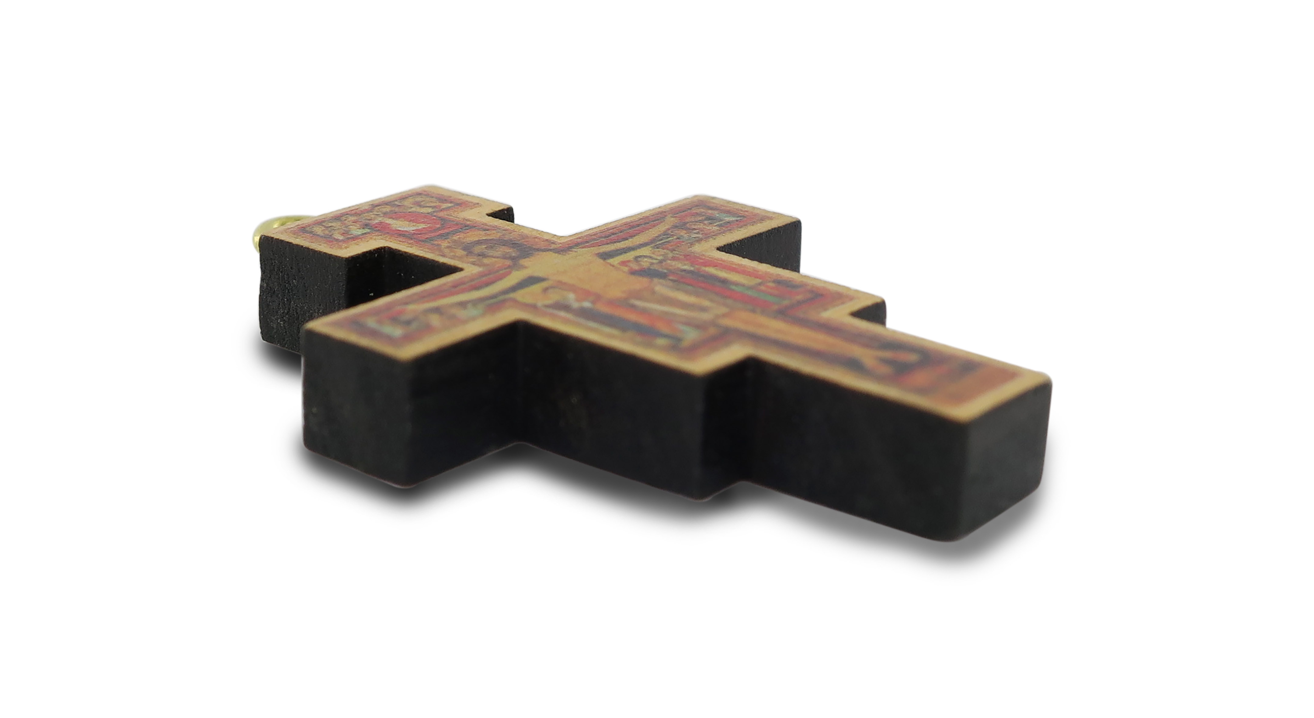 Croce pendente di San Damiano, completa di cordone. Si tratta di una stampa su legno d'ulivo. Misure della croce: 4 x 3 cm. Realizzato in Italia.